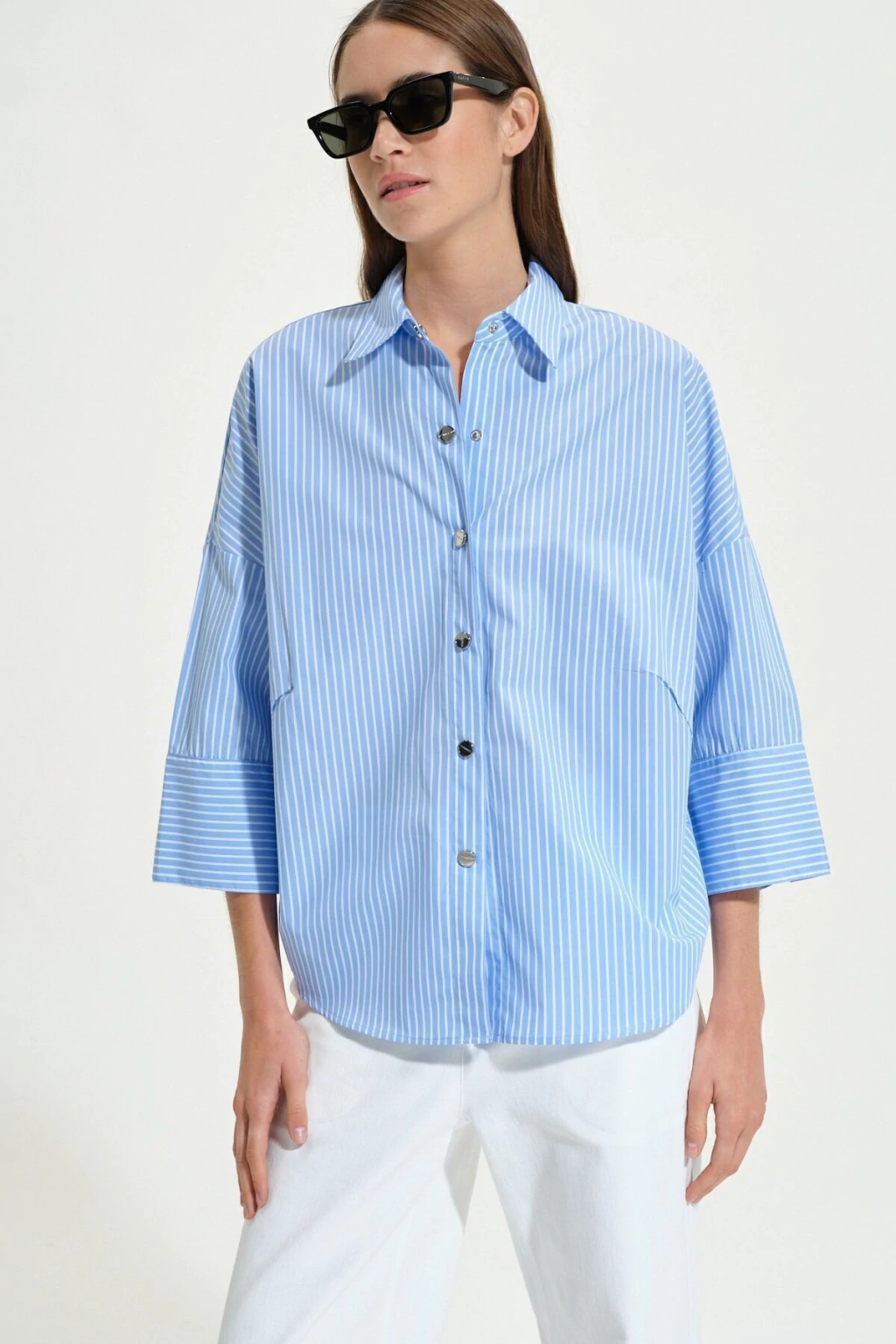 Camisa de poplín a rayas larga hasta la cadera con mangas largas. Tiene cuello solapa y botones snap metálicos. Lleva dos pinzas a cada lado del delantero. Ideal para usar todos los días.