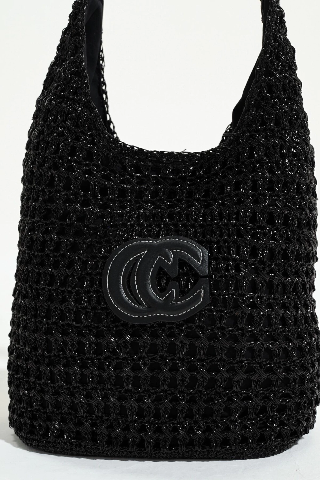 Cartera tejida en rafia con el logo de Carmela bordado en el frente. Tira al hombro. Botón metálico con imán.