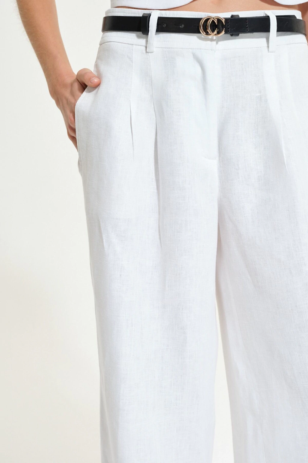 Pantalón de tiro alto con tablas en el delantero, corte ancho con cierre frontal y gancho metálico. Tiene bolsillos delanteros y traseros. Es una prenda de lino súper fresca perfecta para darle un touch de elegancia a tus looks. Combinalo con el chaleco Amalia para armar el conjunto!