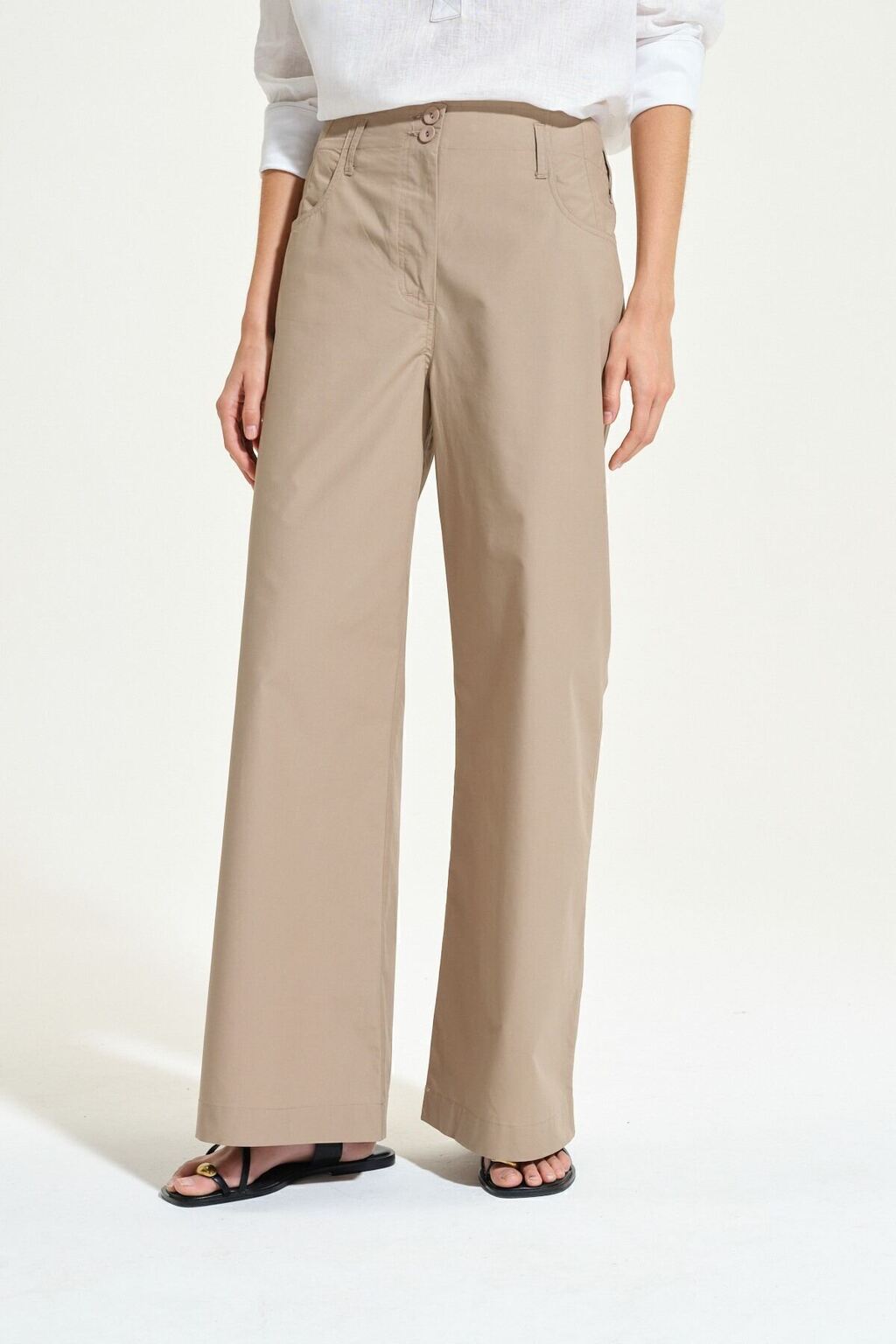 Pantalón de poplin tiro alto corte recto amplio. Lleva presillas. Acceso frontal con cierre y botones forrados a tono. Tiene bolsillos delanteros y traseros.