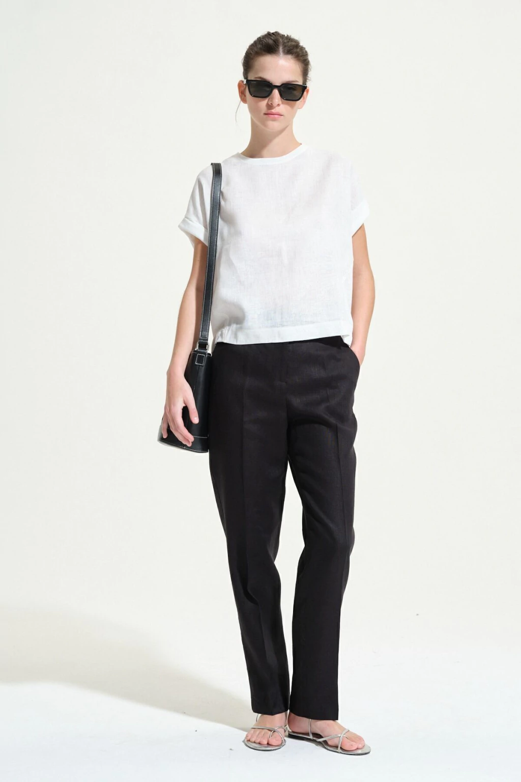 Remera mangas cortas con escote redondo y corte recto. Tiene recortes con distintas telas, el delantero es de lino y la espalda de algodón mell. Una prenda simple y versátil con un touch de elegancia para tus looks de verano.