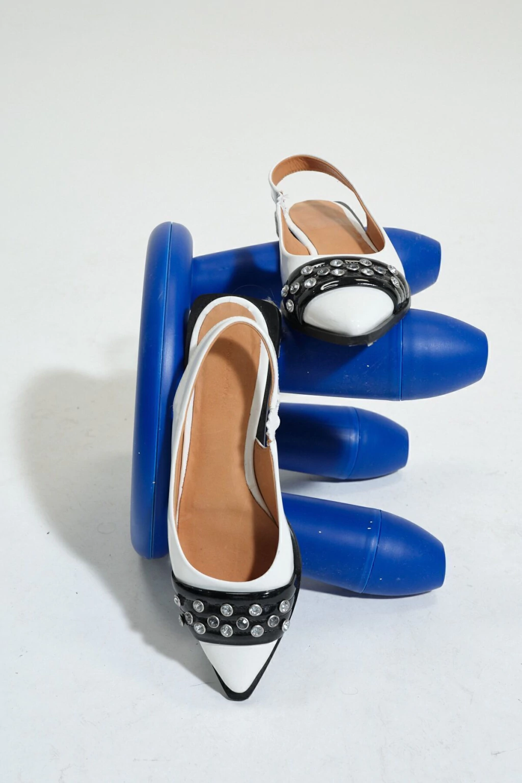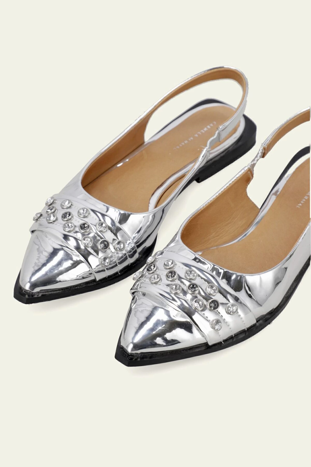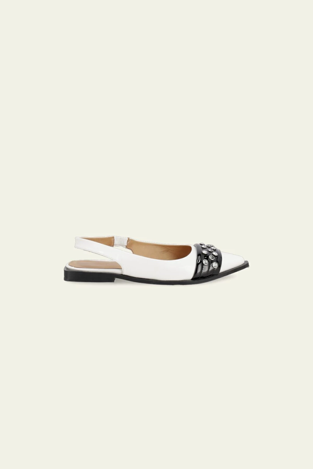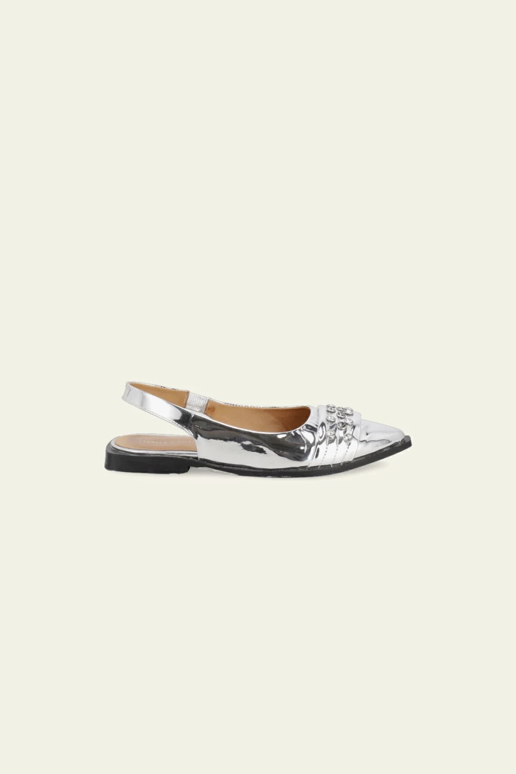 Zapato tipo chatita destalonado. Detalle de tira con remaches de piedras en el delantero. Tira trasera que se agarra al talón. Acabado en punta. Podes encontralo en color plata y en color blanco con detalles en negro.