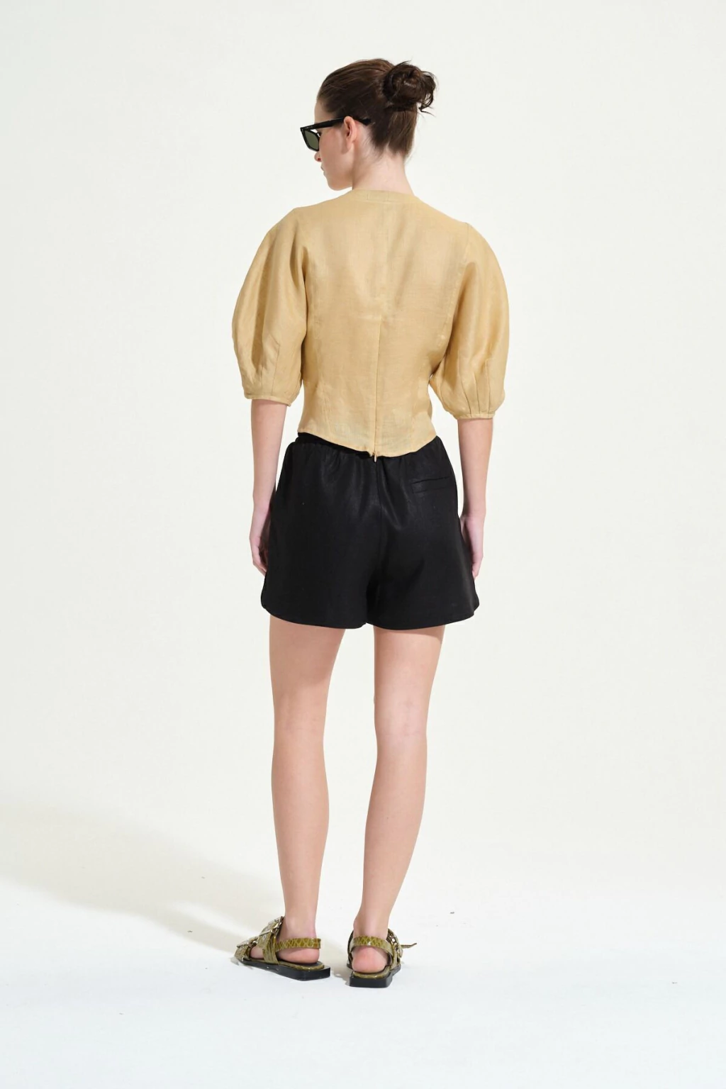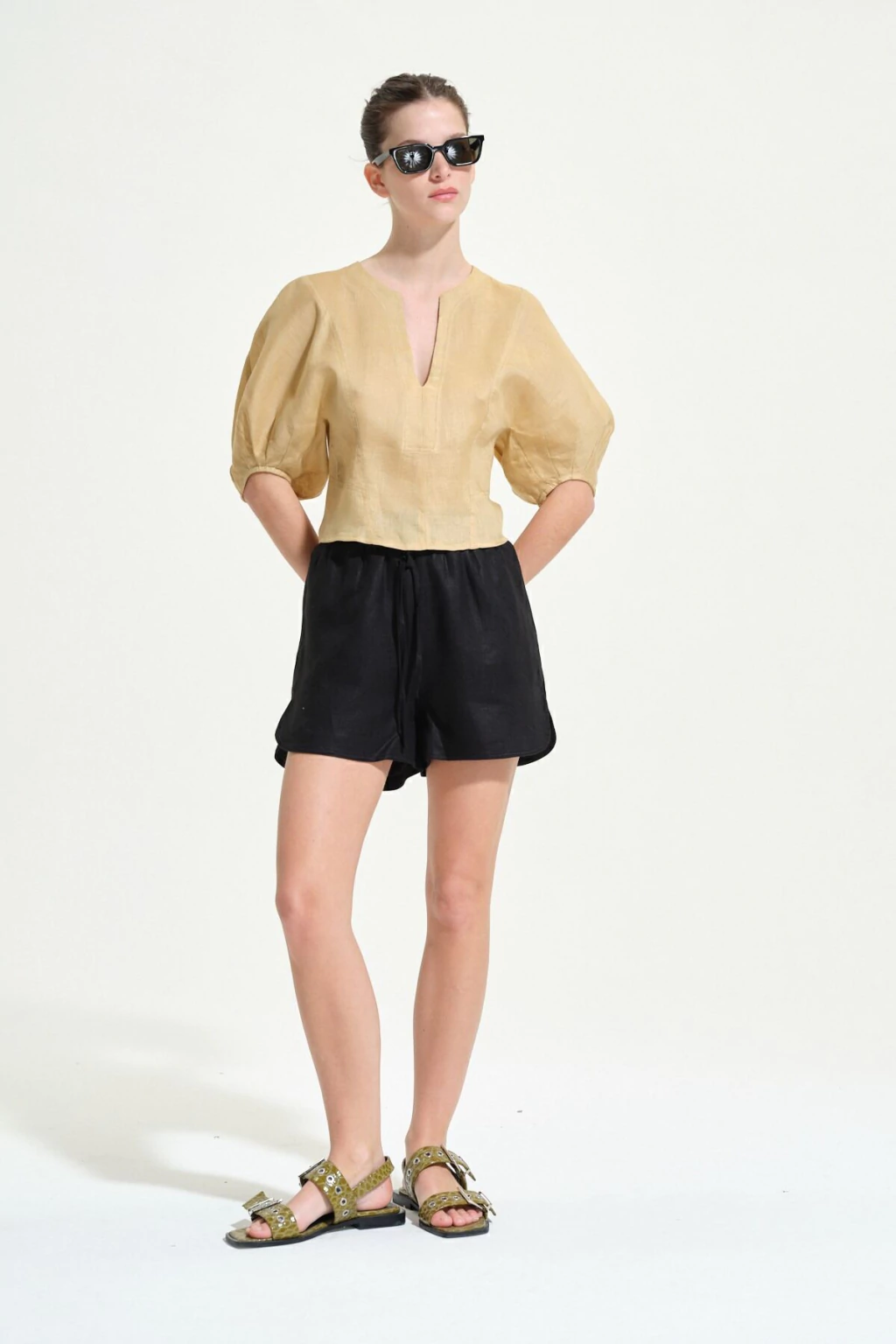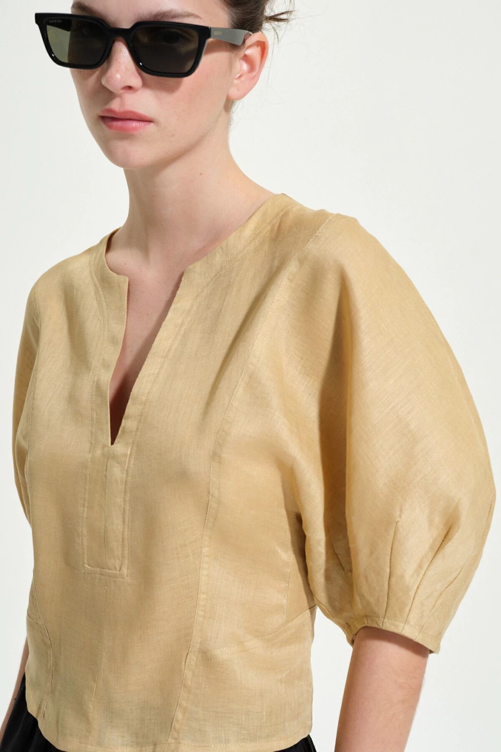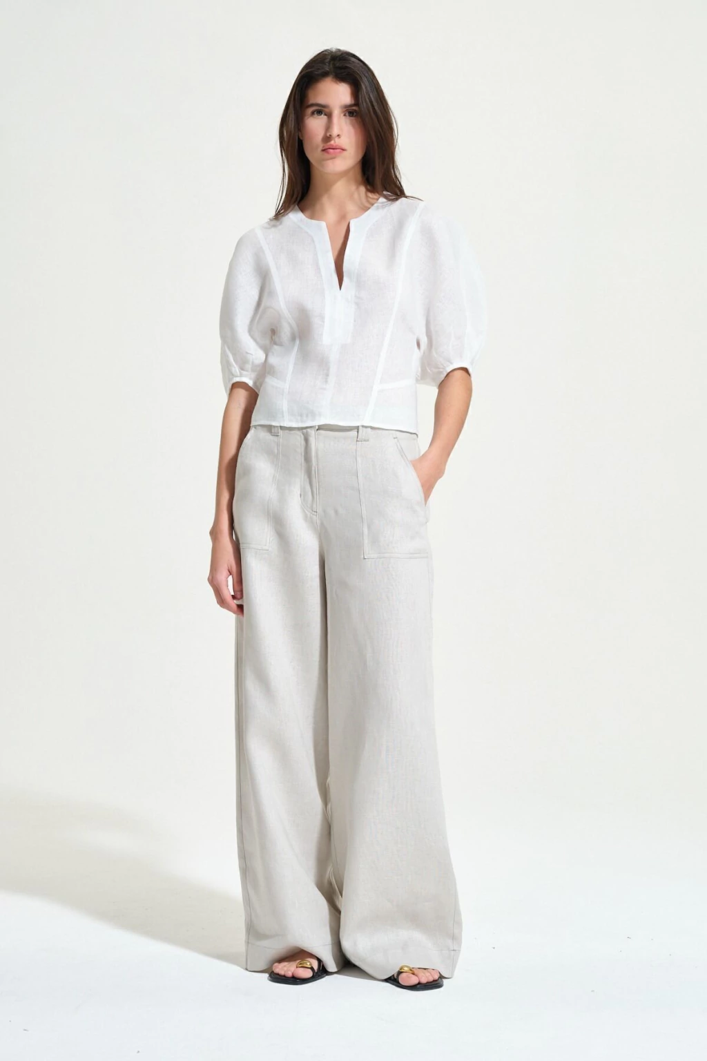 Camisa amplia de lino con recortes en el delantero y trasero, larga hasta la cintura. Tiene cuello solapa y mangas largas terminadas en puño. Podes encontrarla en color blanco y en camel.