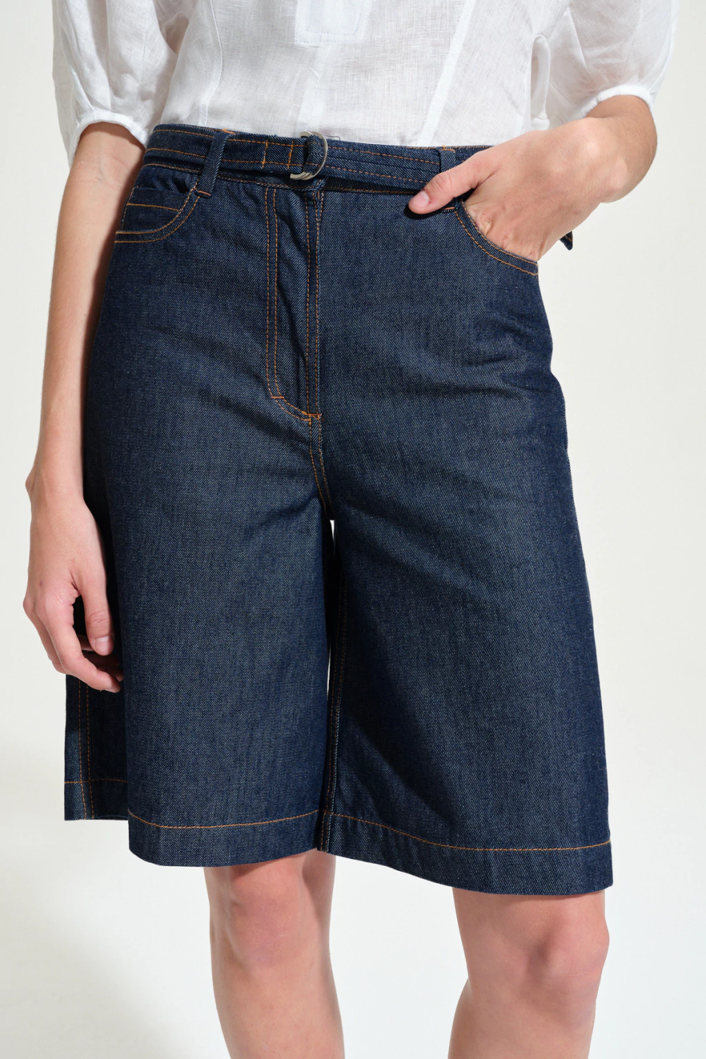 Bermuda de denim azul tiro alto y corte recto amplio. Lleva bolsillos delanteros y traseros. Tiene un cinturón de tela base con hebilla metálica. Combinalo con la batita y la chaqueta Cala para armar el conjunto!
