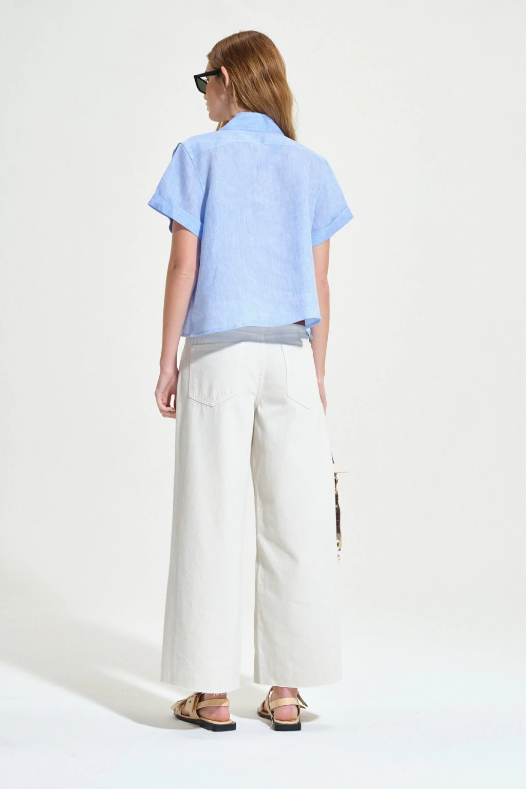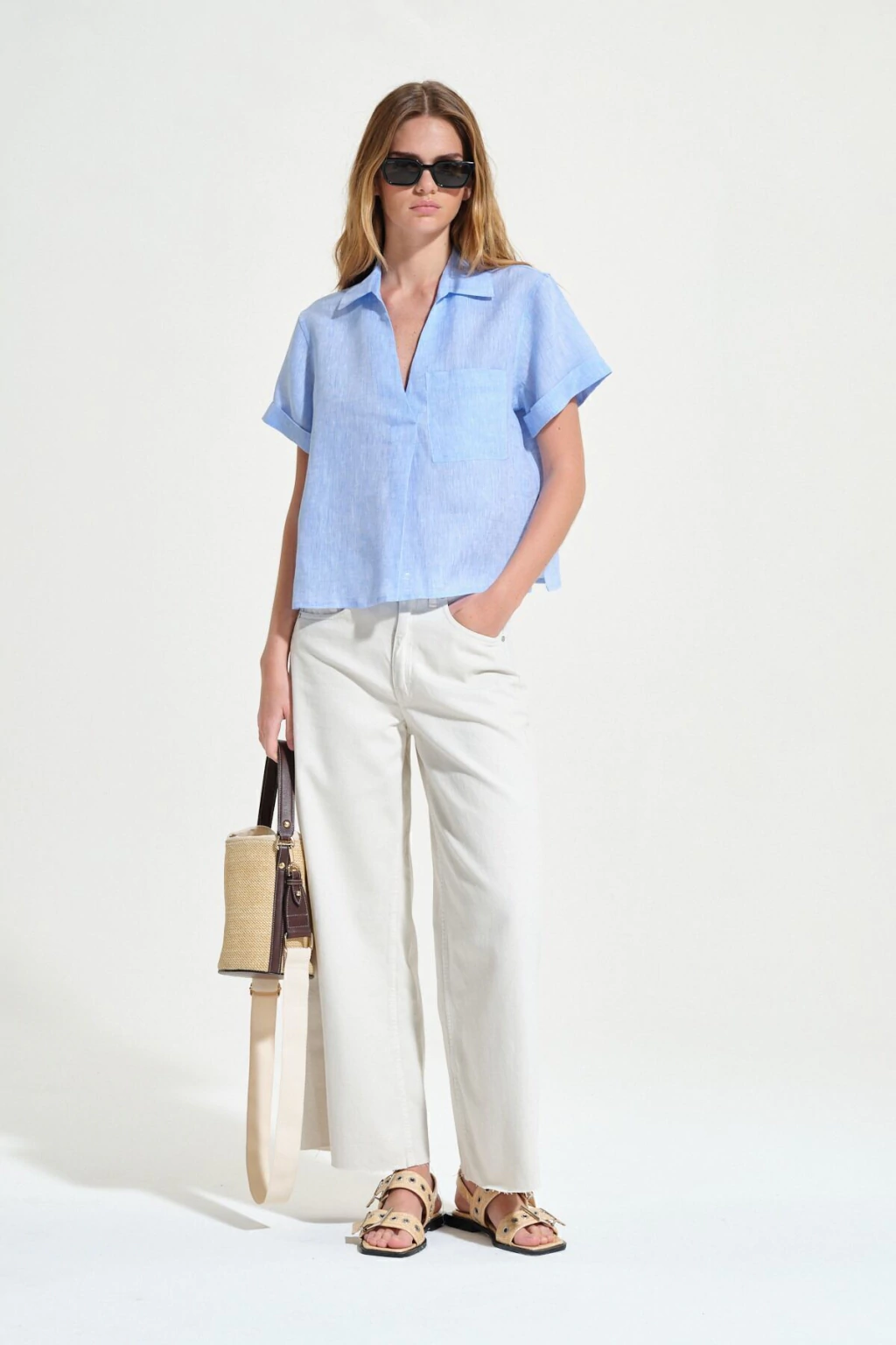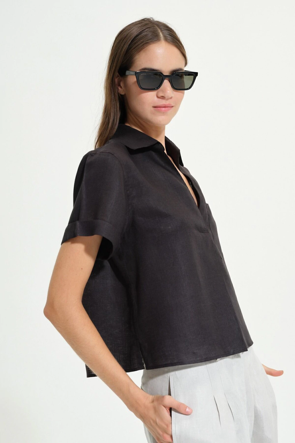 Camisa de lino con escote en "V" y cuello solapa. Larga hasta la cintura con mangas cortas. Podes encontrarla en color blanco, camel, sky, cherry y negro.