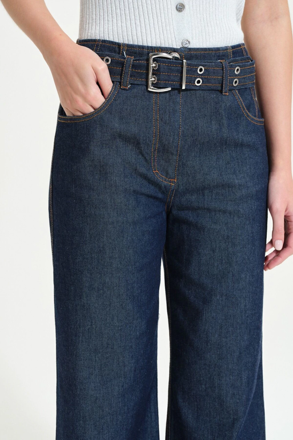 Pantalón de denim azul tiro alto y corte recto amplio. Lleva bolsillos delanteros y traseros. Tiene un cinturón de tela base con ojalillos y hebilla metálica. Combinalo con la batita y la chaqueta Cala para armar el conjunto!