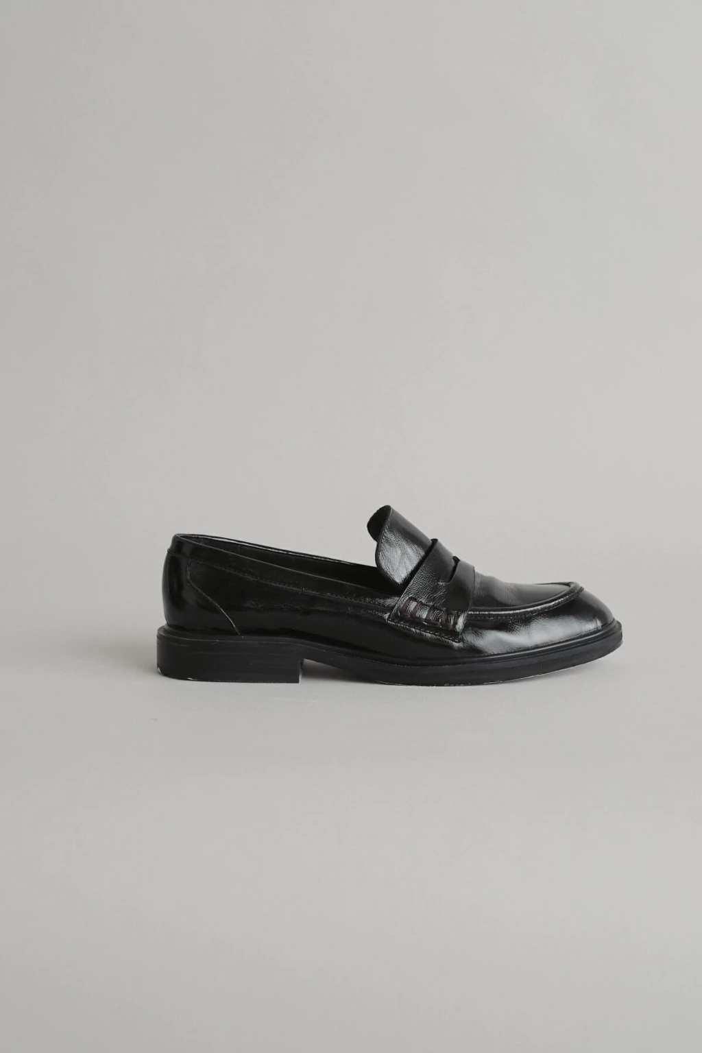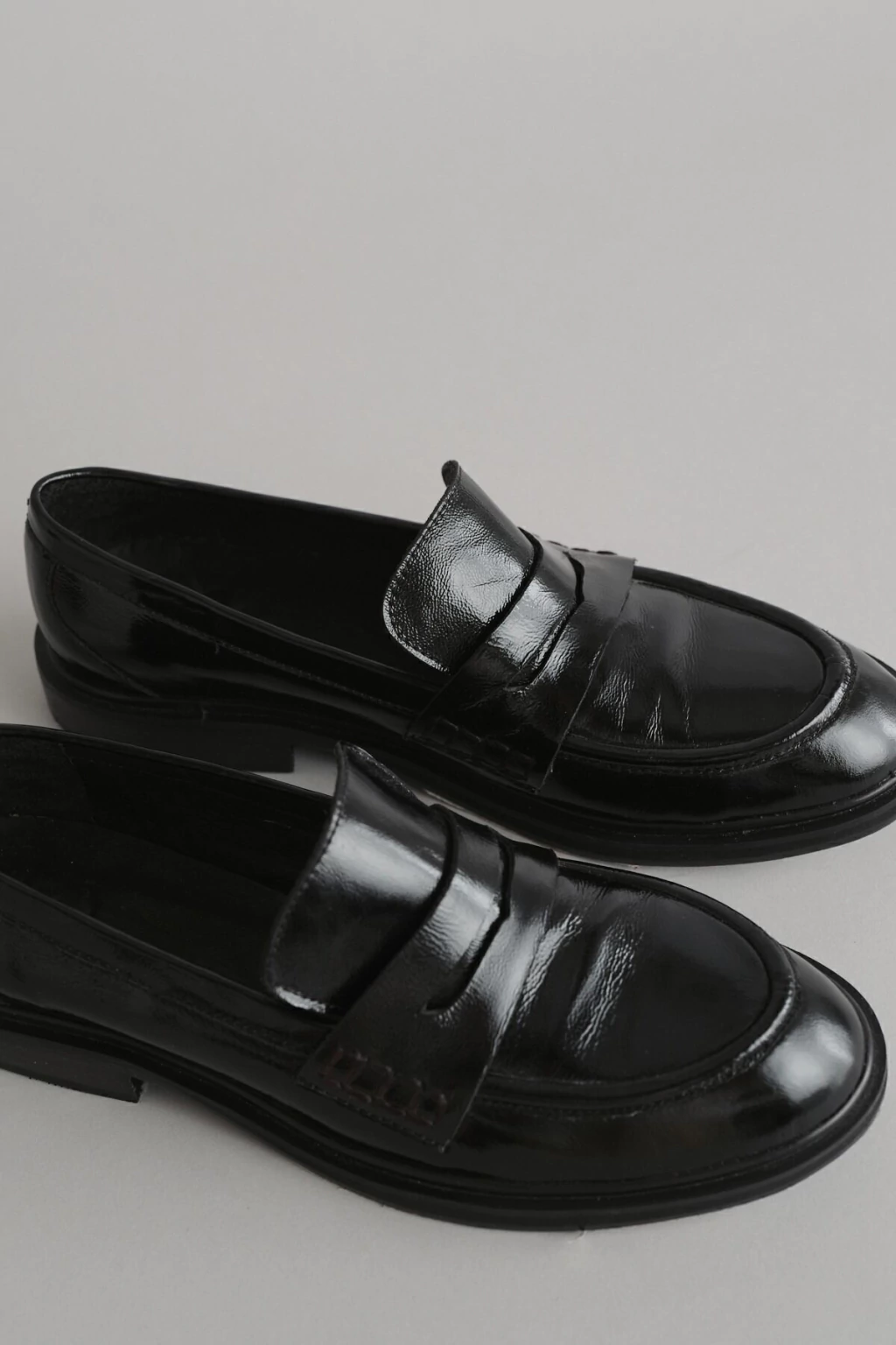 Mocasin de cuero acharolado con detalle en lengueta de puntadas artesanales y forrería de cuero a tono. Un must de esta temporada para estar comoda, en tendencia y elegante.