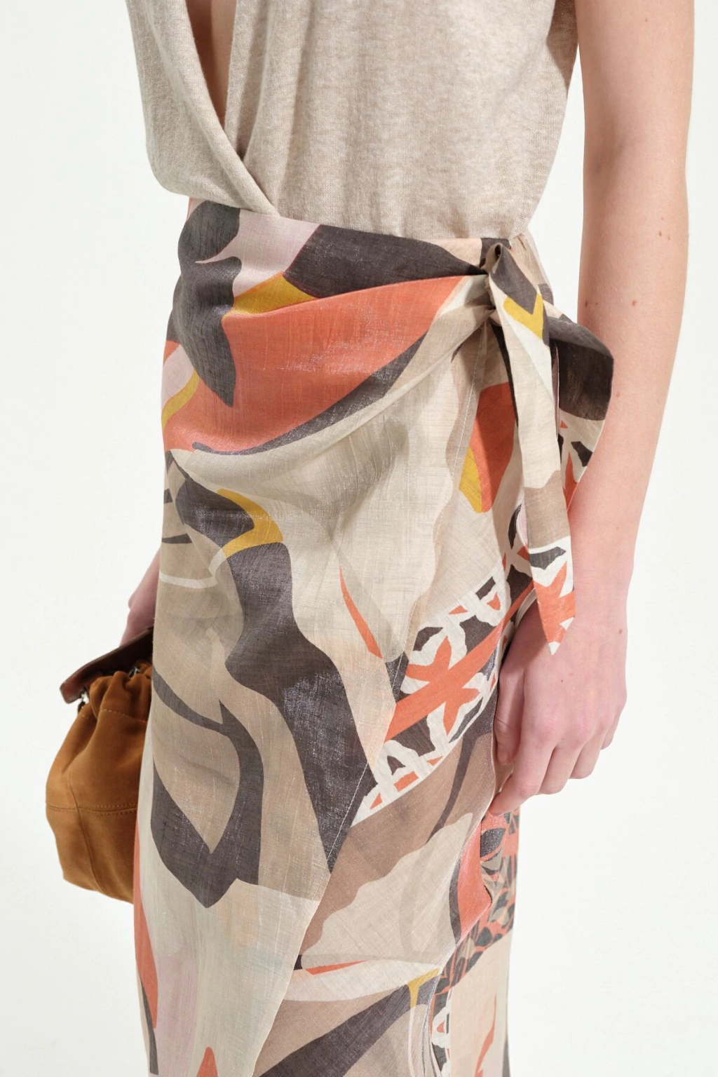 Pollera corta con detalle de superposición en el mismo tejido tipo pareo. Cierre lateral con lazadas que se atan en un nudo. Estampa exclusiva de esta temporada.