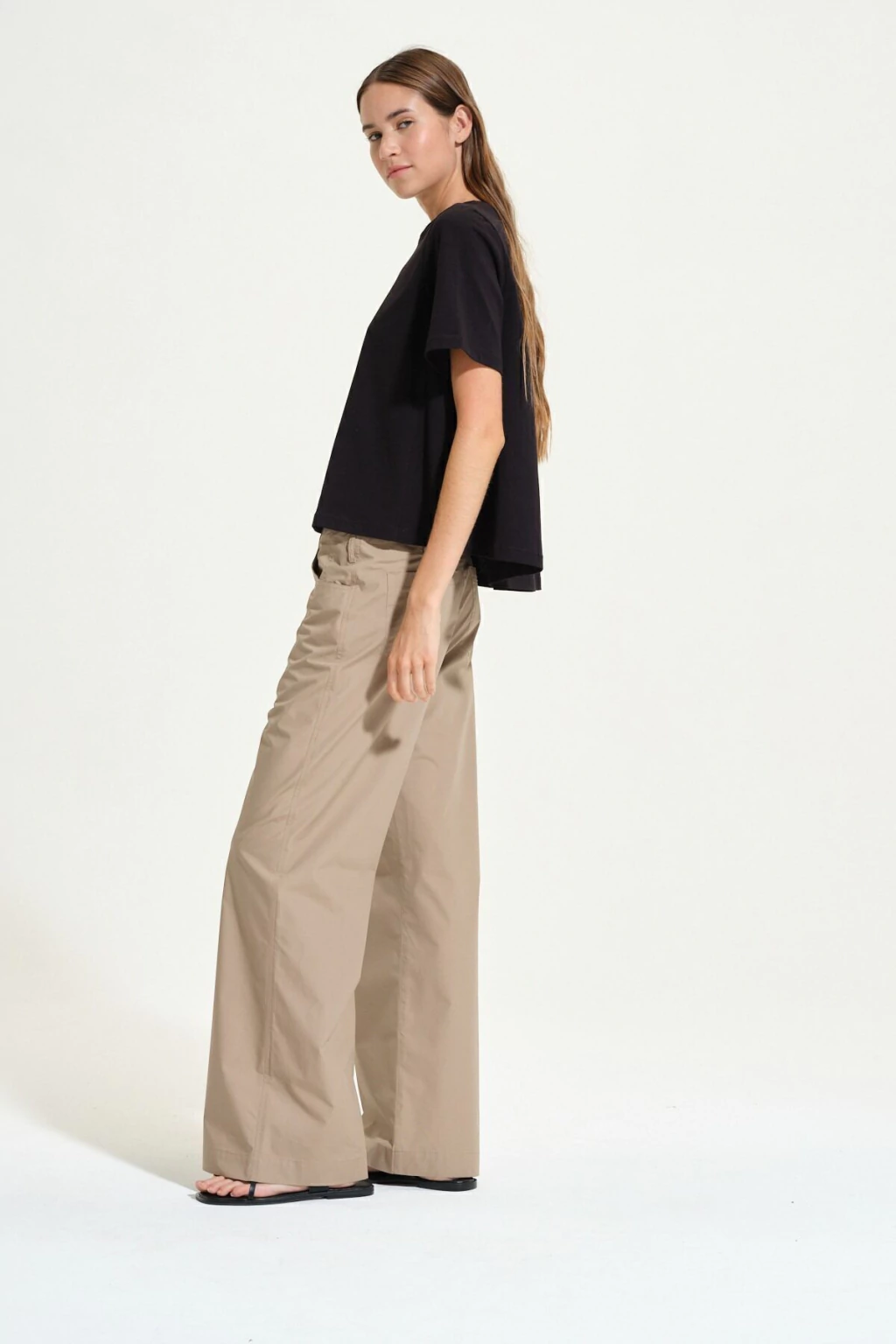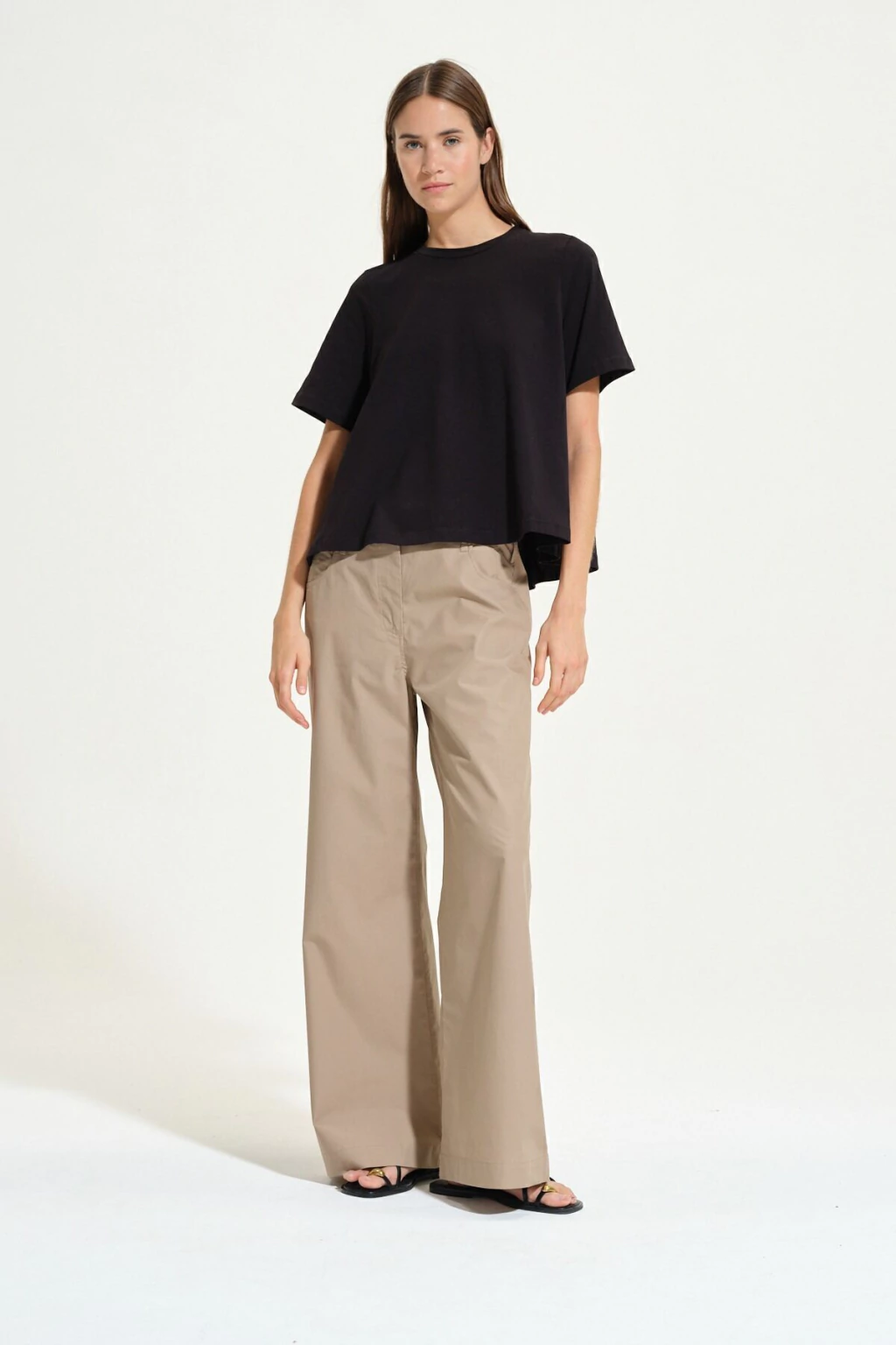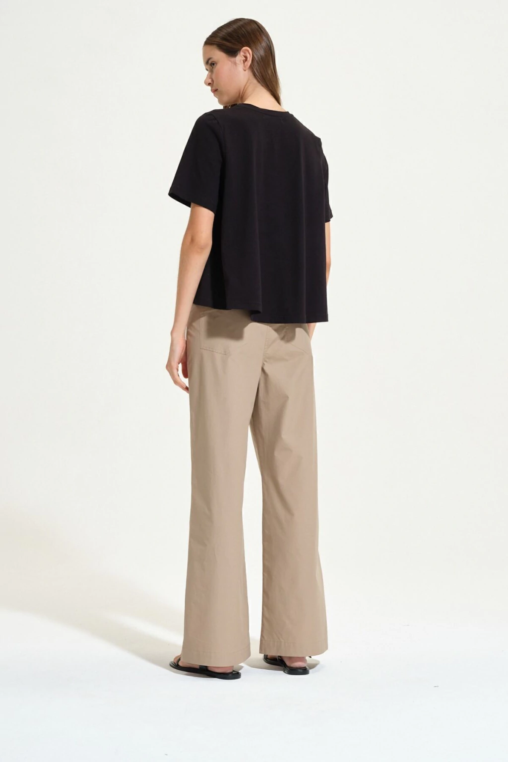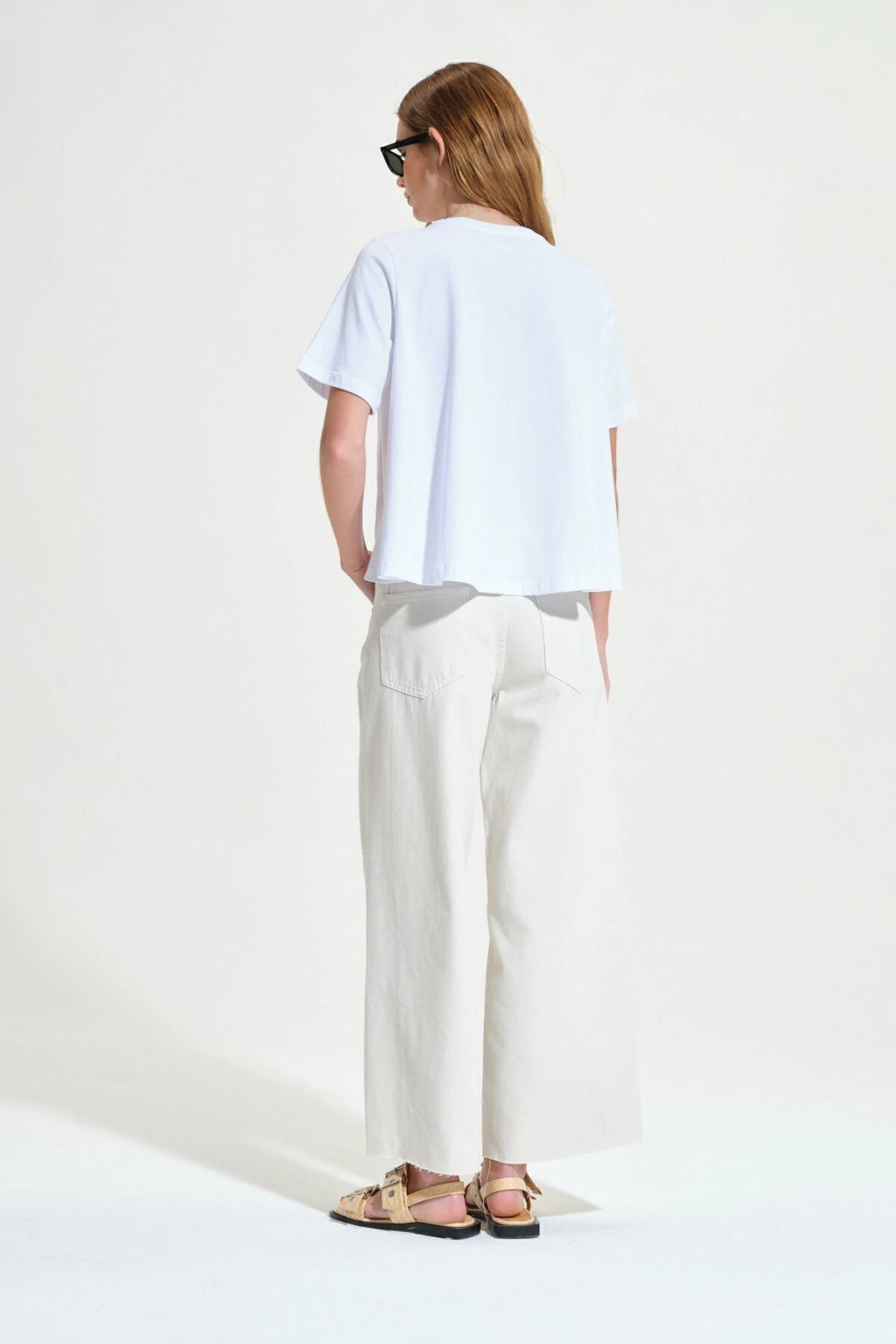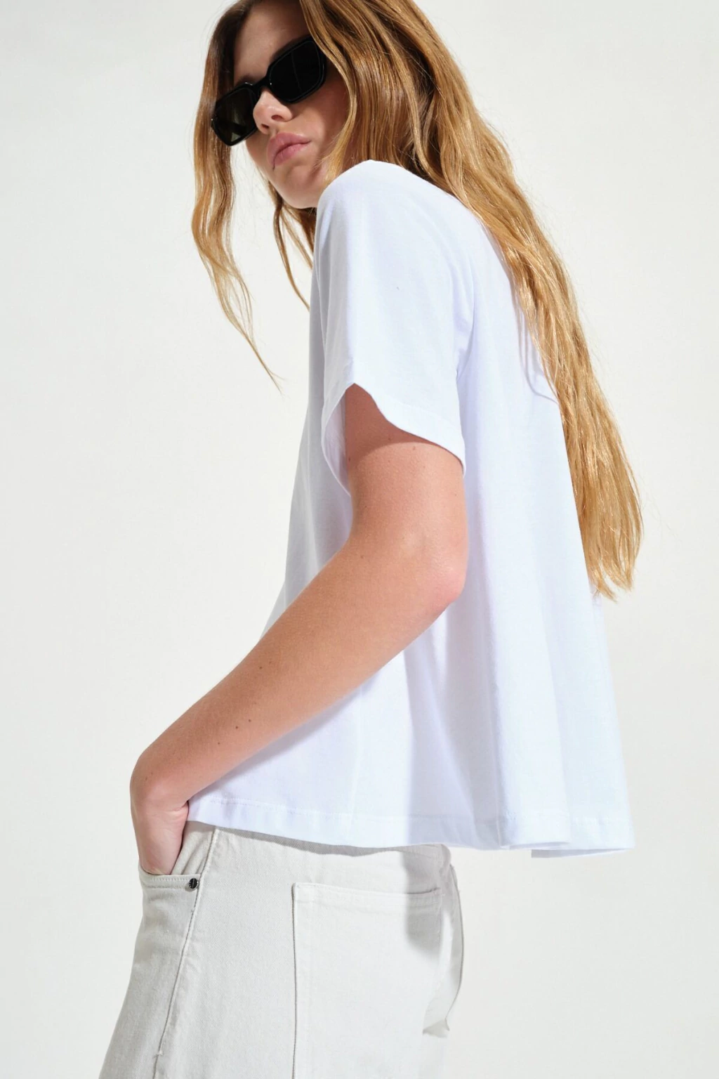 Remera de algodón con escote redondo y mangas cortas. Corte amplio. Es una prenda comodín para todos los días.